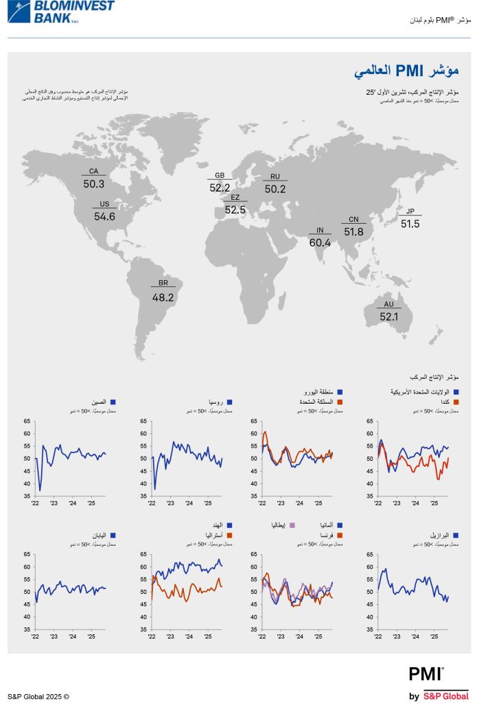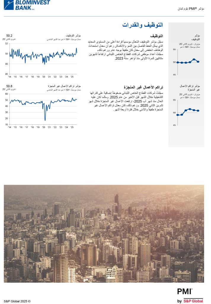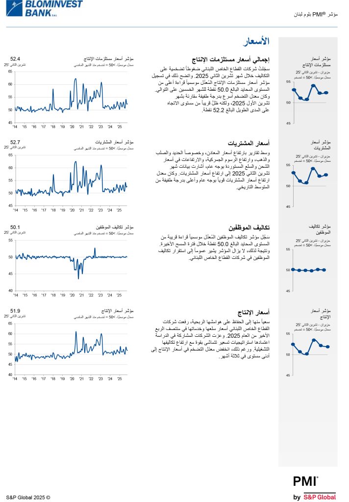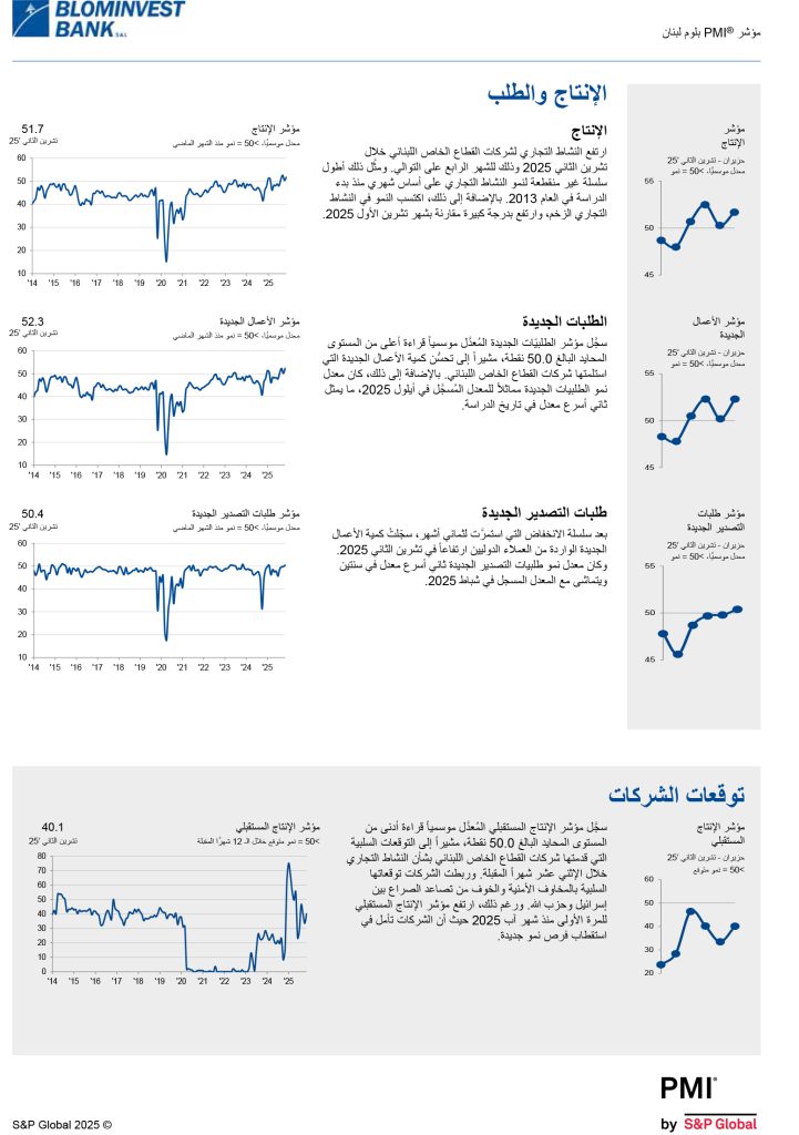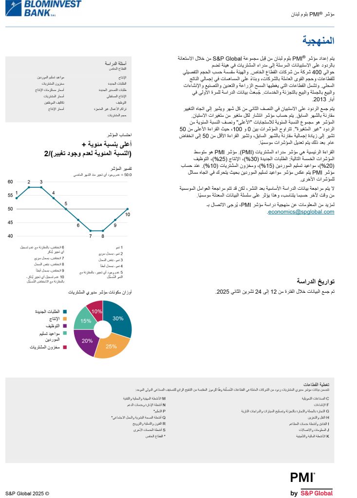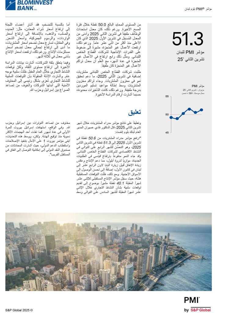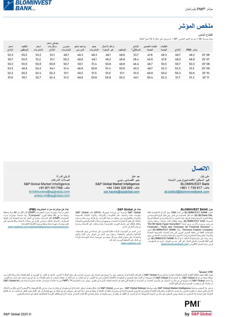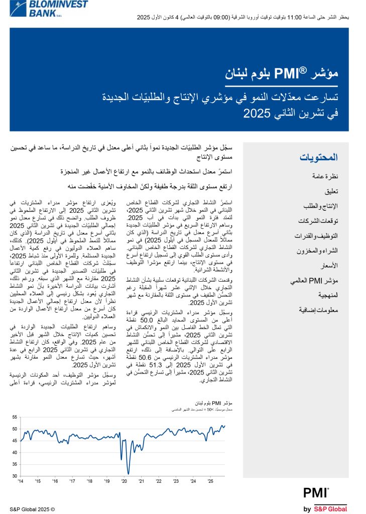 شاركها فيسبوك تويتر لينكدإن تيلقرام واتساب نتائج مؤشر مدراء المشتريات للبنان BLOM PMI لشهر تشرين الثاني 2025 مؤشر مدراء المشتريات تسارعت معدّلات النمو في مؤشري الإنتاج والطلبيّات الجديدة في تشرين الثاني 2025