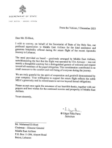 وقد حرصت أمانة سر دولة الفاتيكان في الرسالة الفاتيكانية على توجيه الشكر لشركة طيران الشرق الأوسط “الميدل ايست” تقديرا لما قدمته من “ضيافة راقية” خلال رحلة الوفد البابوي من بيروت إلى روما.